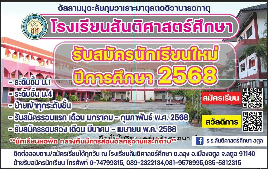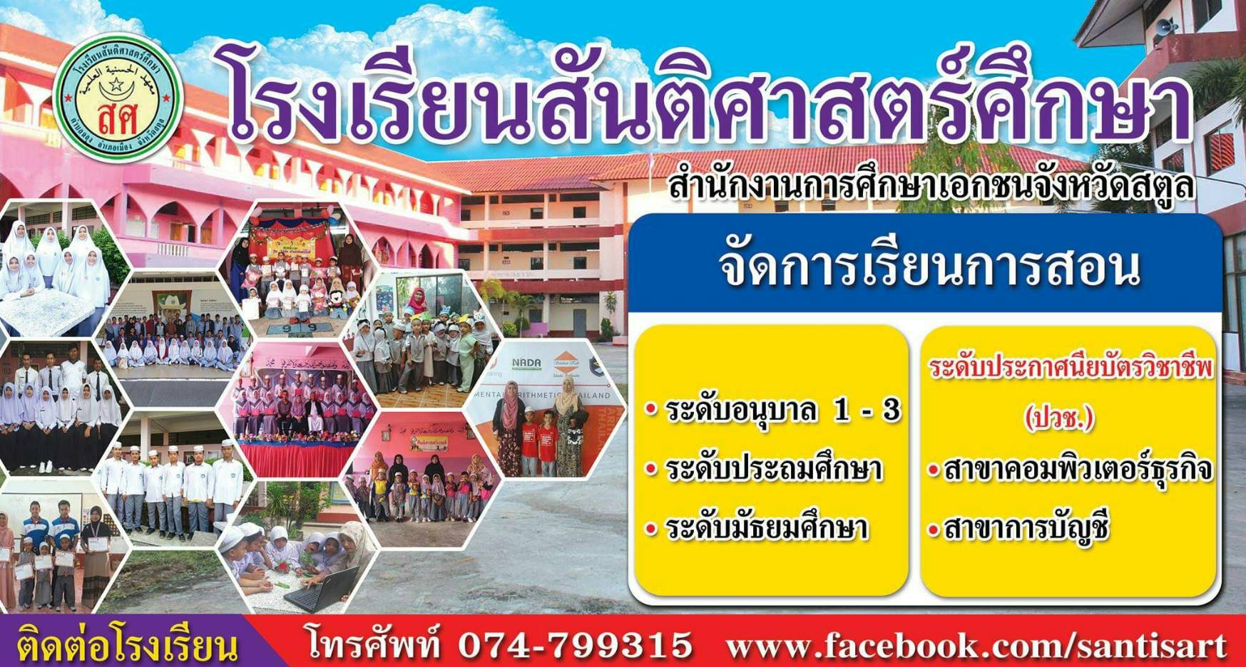 โรงเรียนสันติศาสตร์ศึกษา ตำบลฉลุง อำเภอเมืองสตูล จังหวัดสตูล 91140 โทร. 074-799315,....Fax. 074-799315